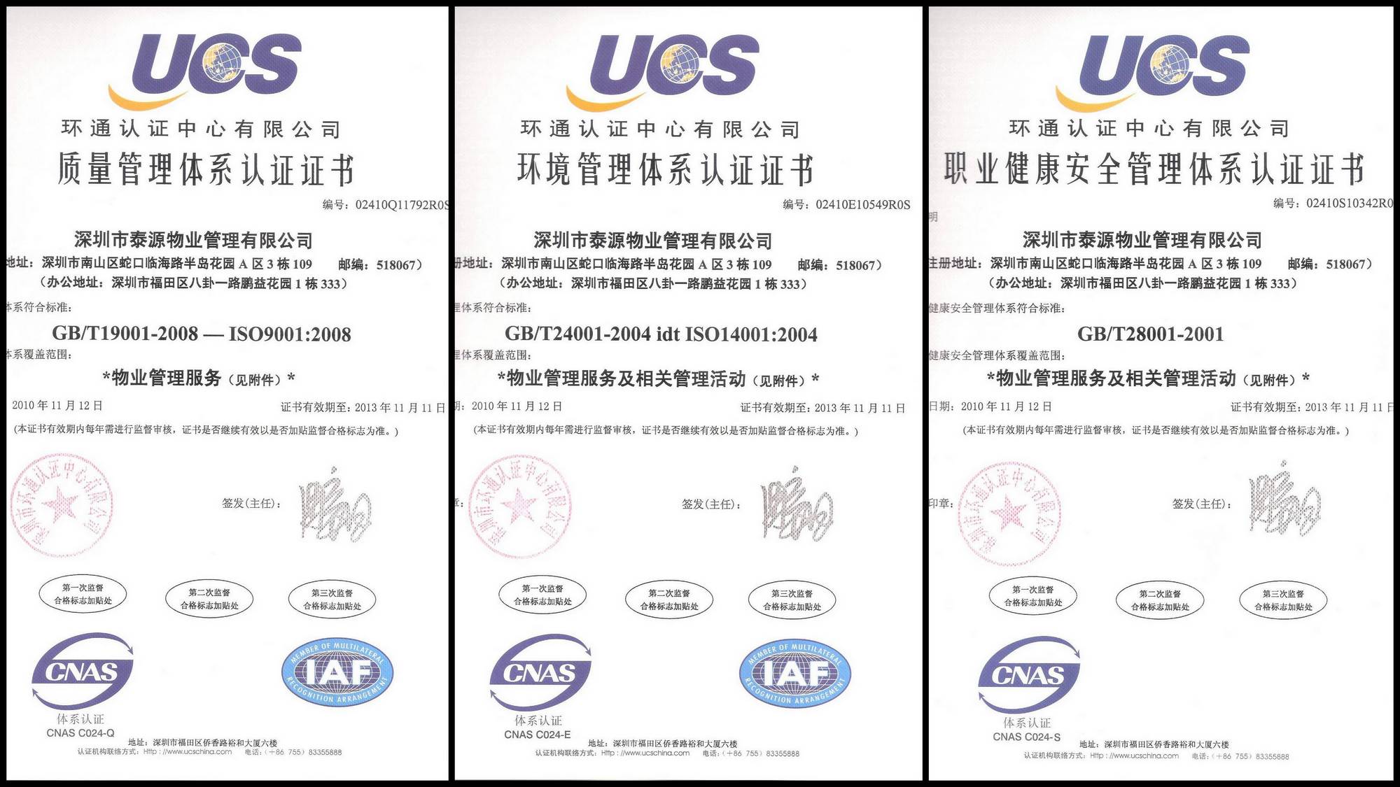 2010年10月13日、20日、21日我司鳴翠谷物業(yè)管理運行體系經(jīng)過深圳環(huán)通質(zhì)環(huán)認證中心的楊總帶領(lǐng)4位高級審核員的嚴格審核,順利通過了ISO9000質(zhì)量管理體系,ISO14000環(huán)境管理體系和OHSAS18000職業(yè)安全衛(wèi)生管理體系一體化認證審核,從而使我公司繼續(xù)保持了物業(yè)管理的規(guī)范化、系統(tǒng)化、科學化運作,為我公司提供優(yōu)質(zhì)服務(wù)、拓展項目打下了堅實的基礎(chǔ)。