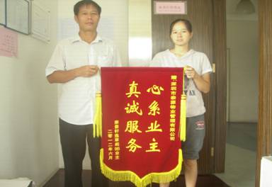 回憶管理處人員為排除積水被汗水濕透衣衫的辛勞,謝絕現(xiàn)金酬勞的真誠服務(wù),特制作了“心系業(yè)主,真誠服務(wù)”的錦旗到管理處致謝。