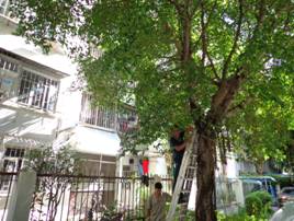 人們都說大樹底下好乘涼,但居住在大榕樹旁的業(yè)主卻到管理處訴說許多困擾——由于樓棟間距小,高大枝繁葉茂的榕樹不但影響他們的通風采光,而且招引蚊蟲,伸進(近)陽臺/窗戶外的樹枝,每當刮風下雨天氣,樹枝就打得陽臺/窗戶咔咔響,存在安全隱患。于是,長期受困憂的業(yè)主到管理處要求給榕樹切枝“美容”,消除困憂。管理處負責人經過走訪部分業(yè)主同意后,安排兩位綠化工到現場實地查看,并制訂切枝可行性方案。在確保業(yè)主安全的前提下,綠化工用鋸子、梯子、繩子等工具,經過艱難的作業(yè),安全地將影響業(yè)主的樹枝修剪或切除。樹枝切除掉落了,困擾業(yè)主的煩心事也解決了。