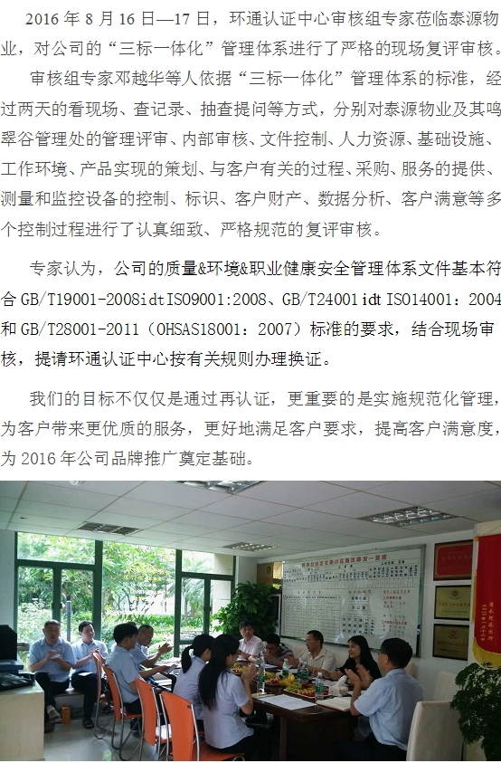 泰源物業(yè)“三標(biāo)一體化”管理體系通過現(xiàn)場(chǎng)復(fù)評(píng)審核