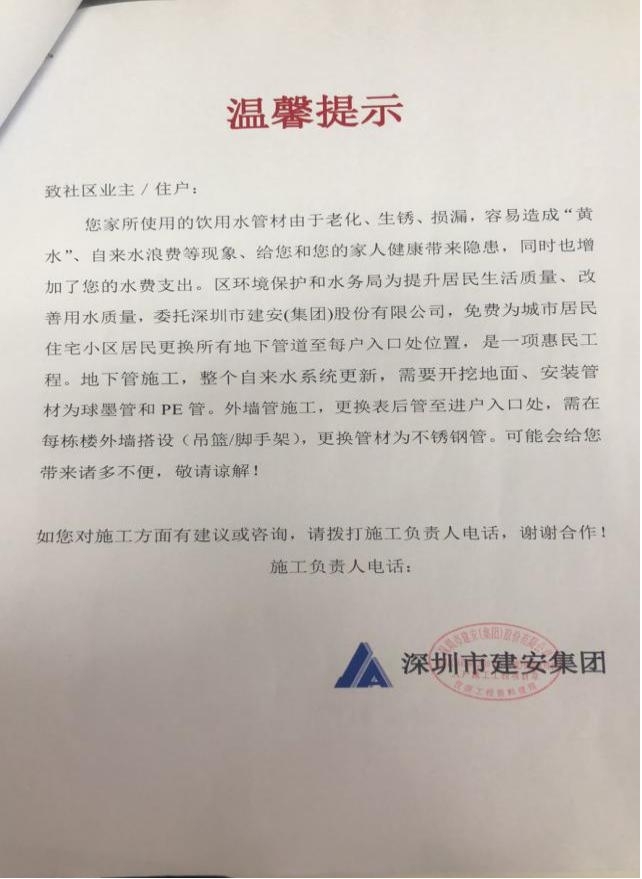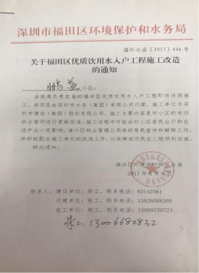 深圳市優(yōu)質(zhì)飲用水入戶工程,是改善居民用水質(zhì)量的惠民工程。鵬益花園小區(qū)的飲用水入戶工程在去年動工,受新型冠狀病毒性肺炎疫情的影響而停工至今。為了更快讓小區(qū)居民早日喝上優(yōu)質(zhì)水,在深圳疫情防控形勢好轉(zhuǎn)后,優(yōu)質(zhì)水工程施工負責(zé)人與管理處于主任在5月經(jīng)過洽談,商定在6月初繼續(xù)施工。